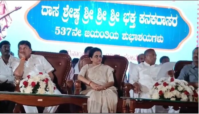 ಸಚಿವ ಕೆ.ಹೆಚ್.ಮುನಿಯಪ್ಪ ಮಾತನಾಡಿ, 12 ನೇ ಶತಮಾನದ ಬಸವಣ್ಣನವರ ವಚನಗಳನ್ನು ಇಂದಿಗೂ ಪ್ರಸ್ತುತ ಸಮಾಜವನ್ನು ಕಣ್ತೆರೆಸಿ ಸಮಾನತೆಯನ್ನು ಸಾರಿದ ಮಹಾನ್ ವ್ಯಕ್ತಿಗಳಲ್ಲಿ ದಾಸ ಶ್ರೇಷ್ಠ ಕನಕದಾಸರು ಒಬ್ಬರು, ಕುಡಿಯುವ ನೀರು, ಗಾಳಿ, ಸೇವಿಸುವ ಆಹಾರ ಒಂದೇ ಆದರೆ ಜಾತಿ ಎಂಬ ಪಿಡುಗನ್ನು ಮಾತ್ರ ಹೊಗಲಾಡಿಸಲು ಹರಸಾಹಸ ಪಟ್ಟರು. ಸಮಾಜದ ಒಳಿತಿಗಾಗಿ ಅವರು ಮಾಡಿದ ಸೇವೆ ಕಂಡು ಕಾಗಿನೆಲೆಯಲ್ಲಿ ಅವರ ಗದ್ದುಗೆ ಕೂಡ ನಿರ್ಮಿಸಲಾಗಿದೆ.ಕಾಗಿನೆಲೆ ಆದಿಕೇಶವನ ಅಂಕಿತನಾಮದಲ್ಲಿ ರಚಿಸಿದ ಕೀರ್ತನೆಗಳು ಇಂದಿಗೂ ಜನಮಾನಸದಲ್ಲಿ ಅಚ್ಚಳಿಯದೇ ಉಳಿದಿವೆ ಎಂದು ತಿಳಿಸಿದರು.