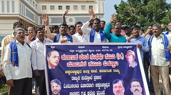 ಚಿಕ್ಕಬಳ್ಳಾಪುರ : ಸುಪ್ರೀಂ ಕೋರ್ಟ್ ಆದೇಶದಂತೆ ಮಾಧಿಗ ಜನಾಂಗಕ್ಕೆ ಪ್ರತ್ಯೇಕ ಒಳ ಮೀಸಲಾತಿ ಜಾರಿ ಮಾಡಬೇಕೆಂದು ಒತ್ತಾಯಿಸಿ ಬೆಳಗಾಂ ಅಧಿವೇಶನದ ಸಂದರ್ಭದಲ್ಲಿ ದಲಿತ ಸಂಘರ್ಷ ಸಮಿತಿ ಹಾಗು ಮಾದಿಗ ಮೀಸಲಾತಿ ಹೋರಾಟ ಸಮಿತಿ ರಾಜ್ಯಾಧ್ಯಂತ ಶಾಸಕರ ಮನೆ ಮುಂದೆ ಪ್ರತಿಭಟನೆ ಹಮ್ಮಿಕೊಳ್ಳಲಾಗಿತ್ತು